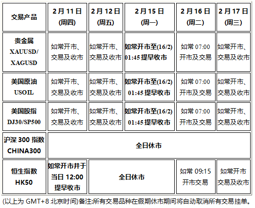 因应美国总统日&中国春节假期影响,以下部分产品的交易时间将于提早或全日休市,敬请阁下知悉留意